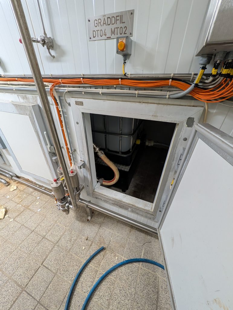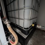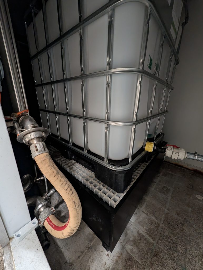 – Kunststoff-IBC-Behälter (1000 l), angeschlossen über flexiblen Schlauch und Kupplungen für die Zufuhr von Zutaten
