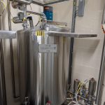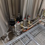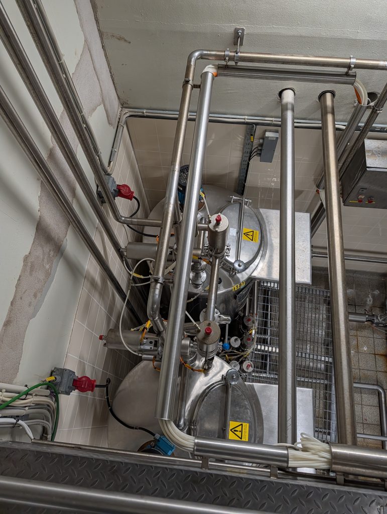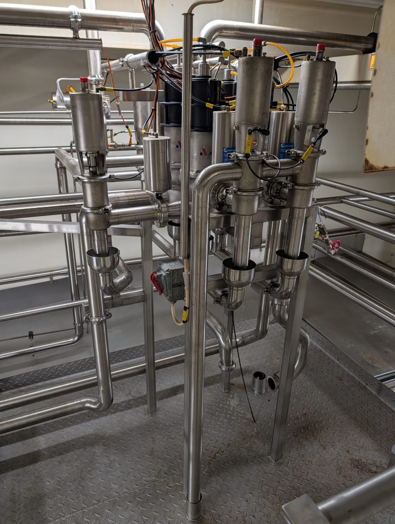 Das Modul umfasst Edelstahltanks mit Rührwerk, Ventilgruppen für die automatische Durchflussregelung und integrierte CIP-Funktion (Cleaning in Place).