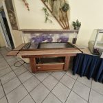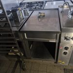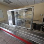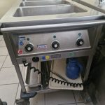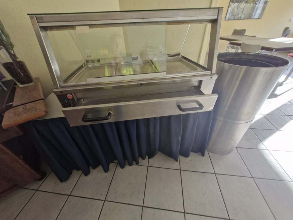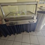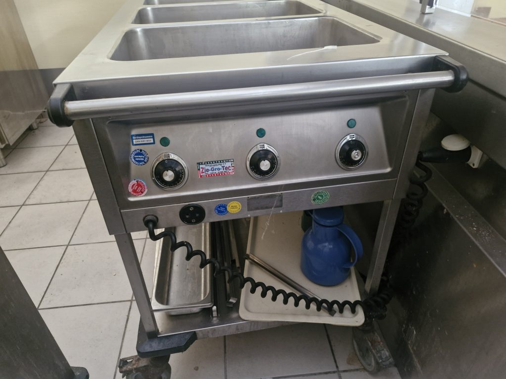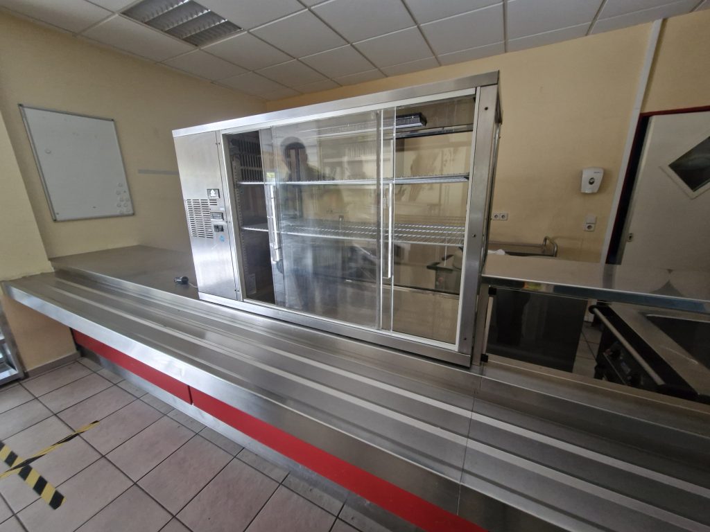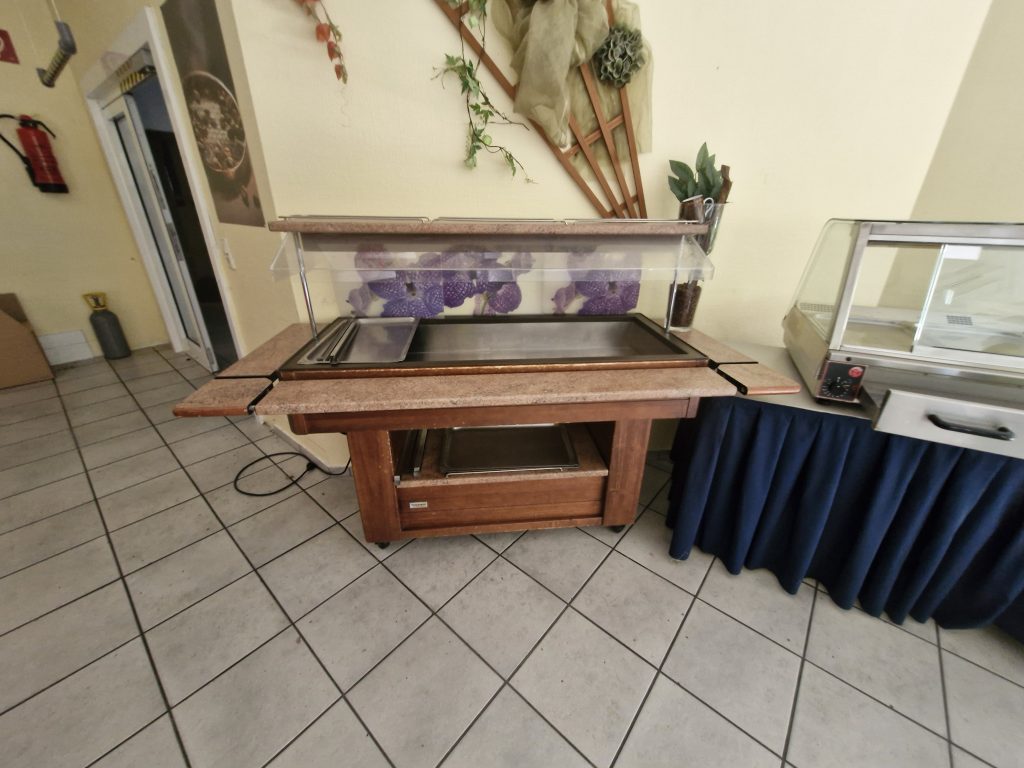 – Speisenausgabe aus Edelstahl und Holz mit Wärmelampe