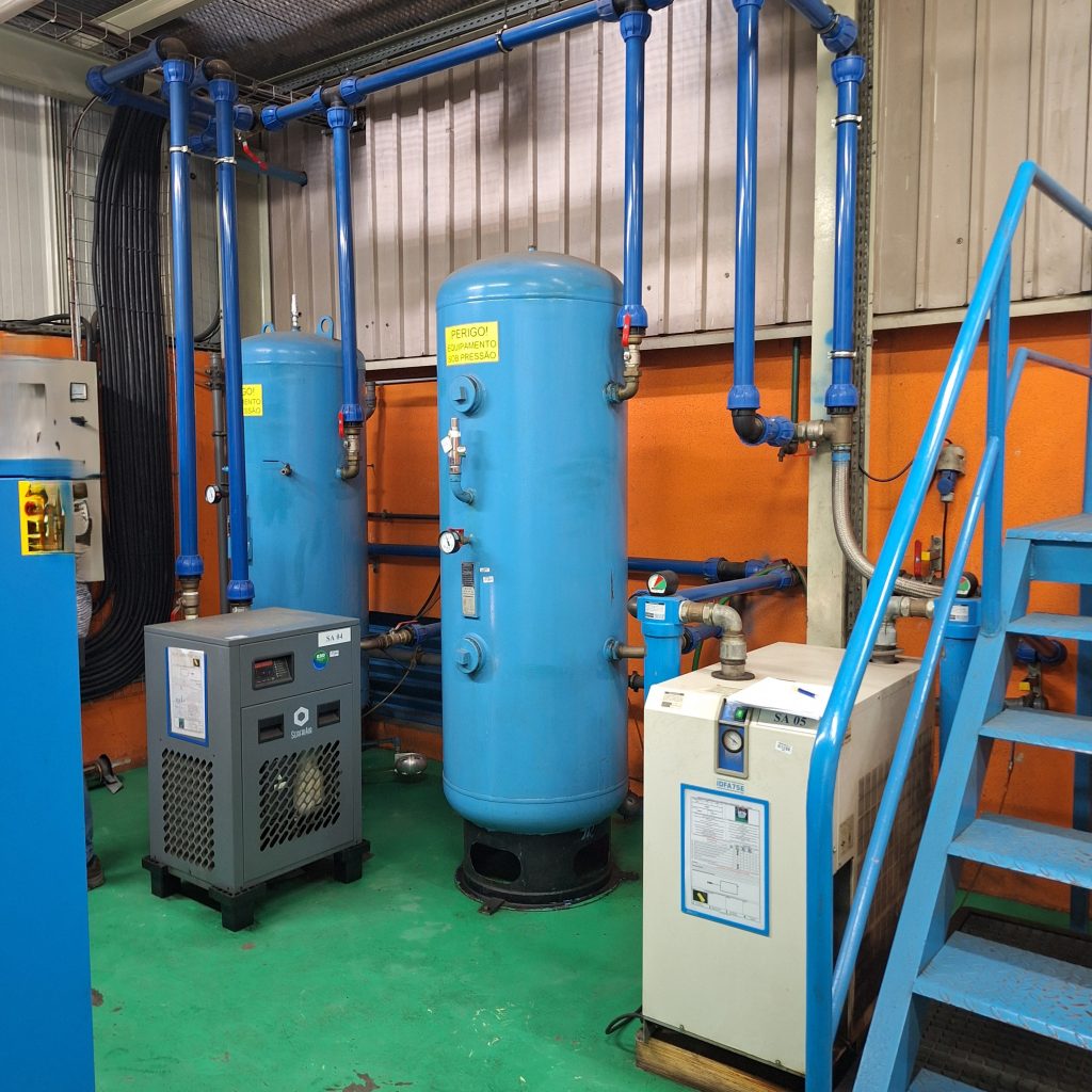 Kompressoranlage bestehend aus Schraubenkompressor, Kältetrockner und vertikalem Druckluftbehälter.