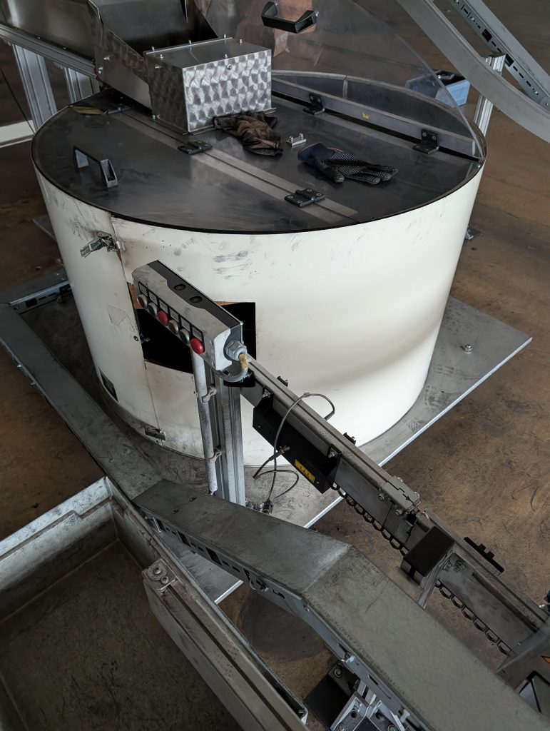 Maschinenart: Förder- und Puffereinheit mit Bandförderer, Aufgabetrichter und Rundtisch